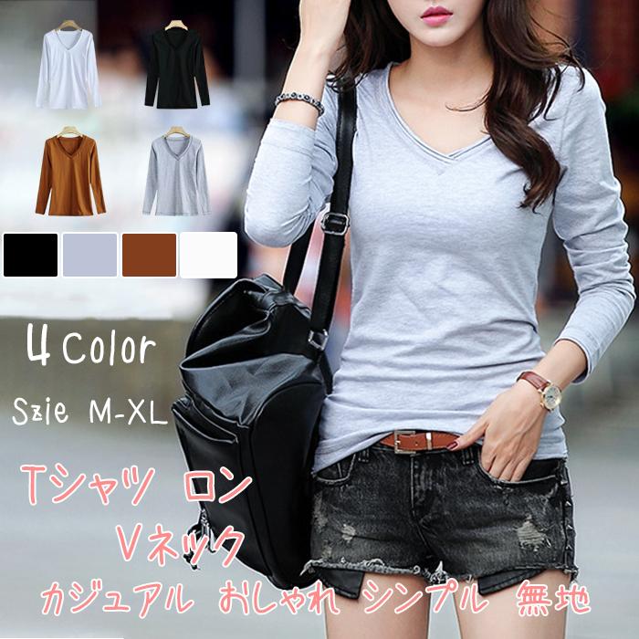 Tシャツ ロンT レディース ロングTシャツ カットソー Vネック きれいめ 大人 カジュアル おしゃれ シンプル 無地 インナー トップス 長袖 ホワイト