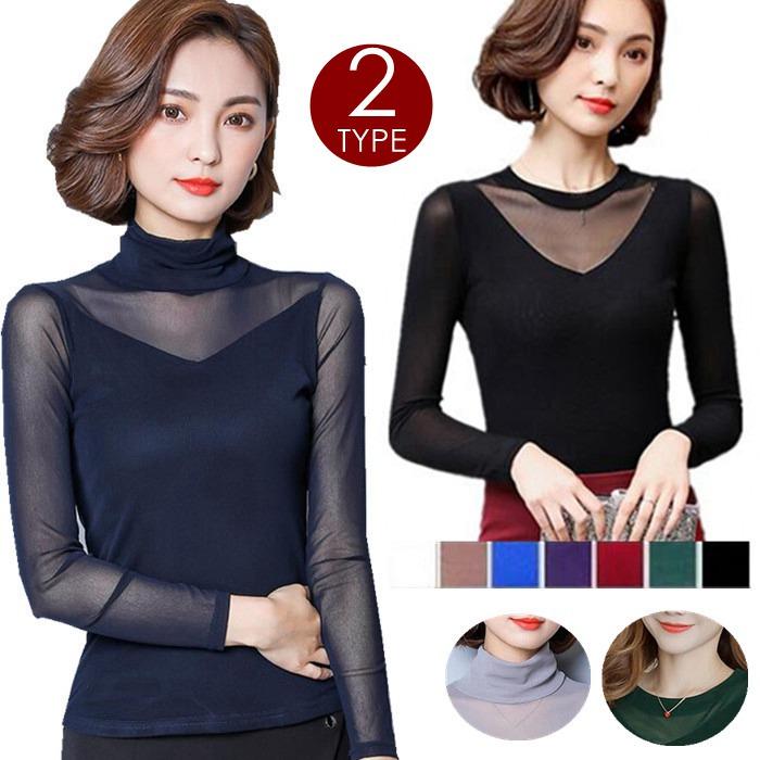 シースルー トップス インナー ハイネック Uネック カジュアル 無地 tシャツ 長袖tシャツ 春秋 レディース カットソー チュール 長袖