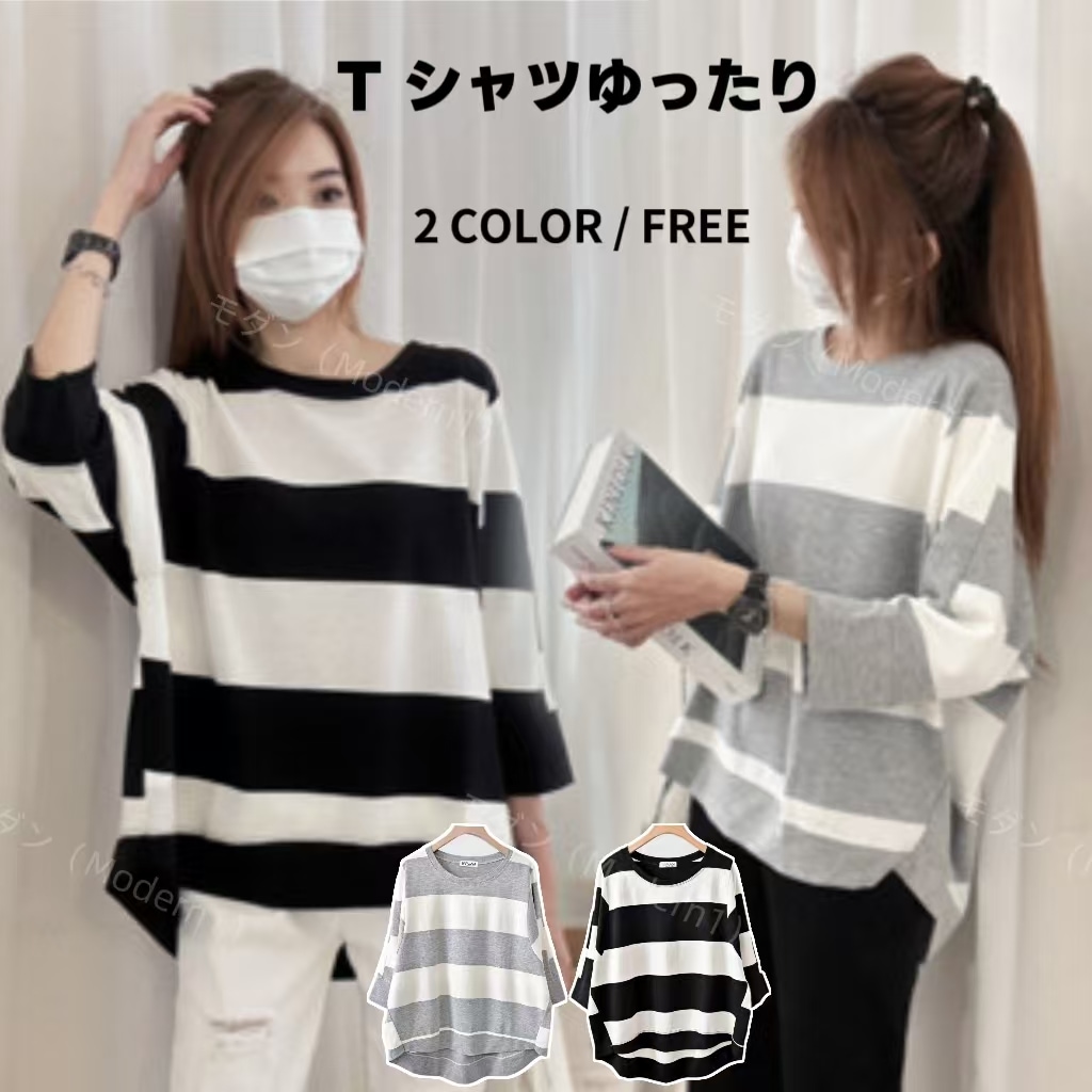 tシャツ カットソー レディース 春物 春夏秋 丸首 長袖 異素材 切り替え 黒tシャツ 白tシャツ サイドスリット ワイドシルエット 無地 ストライプ コットン