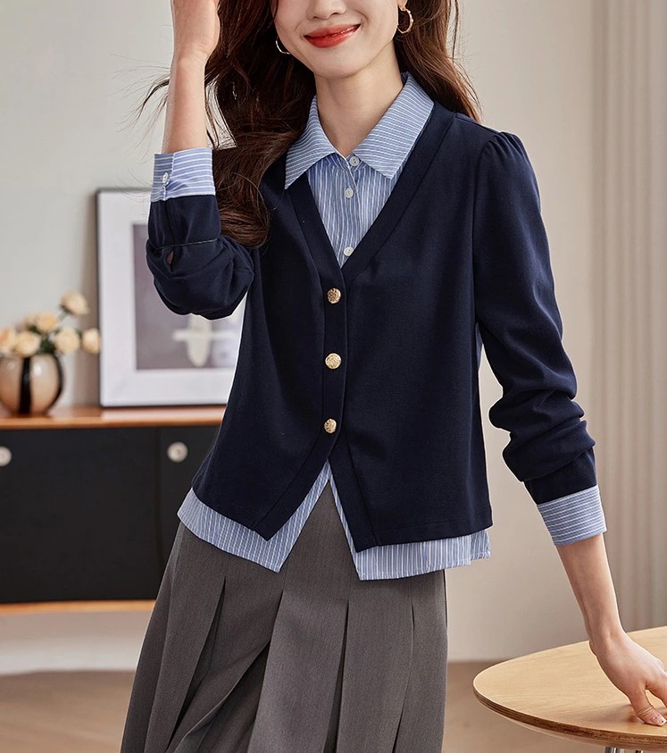 カレッジスタイル偽のツーピースストライプPOLOシャツ襟年齢トップスレイヤードレディースセーター潮2024秋新作 ポロシャツ