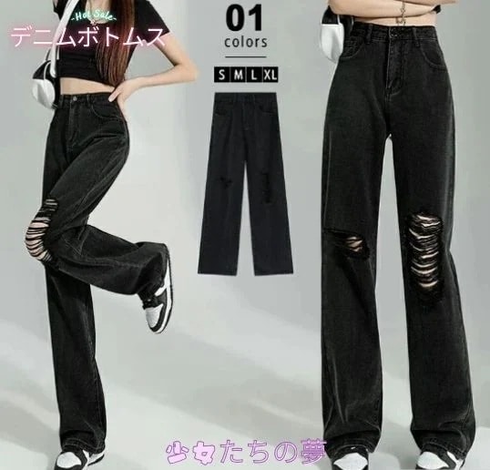 人气 新作 デニムパンツ ブラック ジーンズ レディース 春秋 ゆったり 薄手 ストレート ワイドパンツ モップパンツ デニム ジーンズ