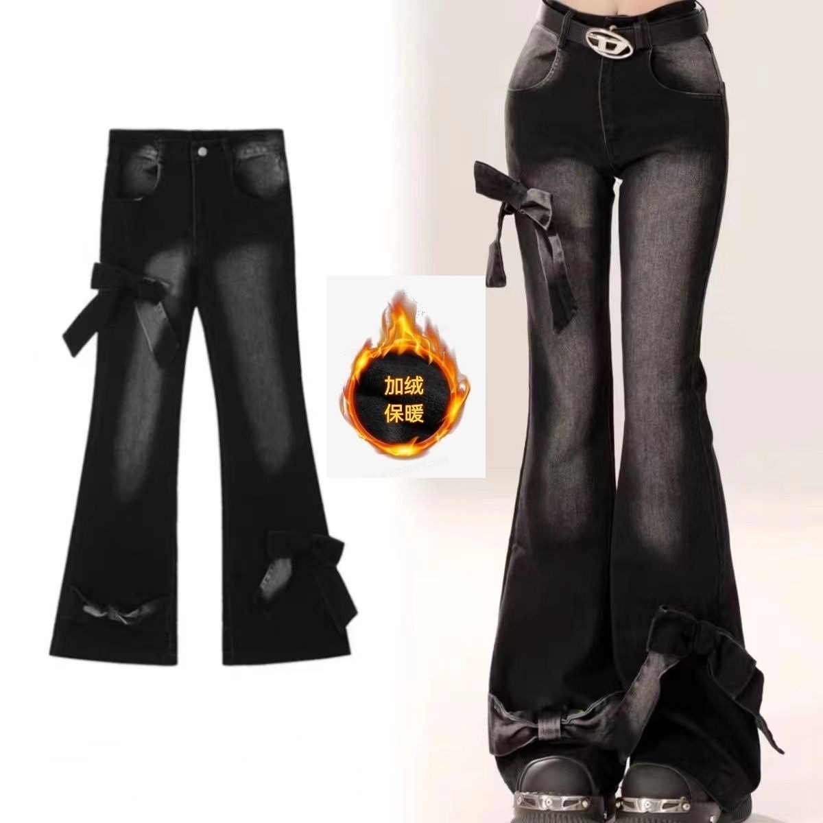 新しいスタイルのパンツヴィンテージ蝶ネクタイフレアパンツジーンズ レディースパッド入り厚手ズボン デニム ジーンズ
