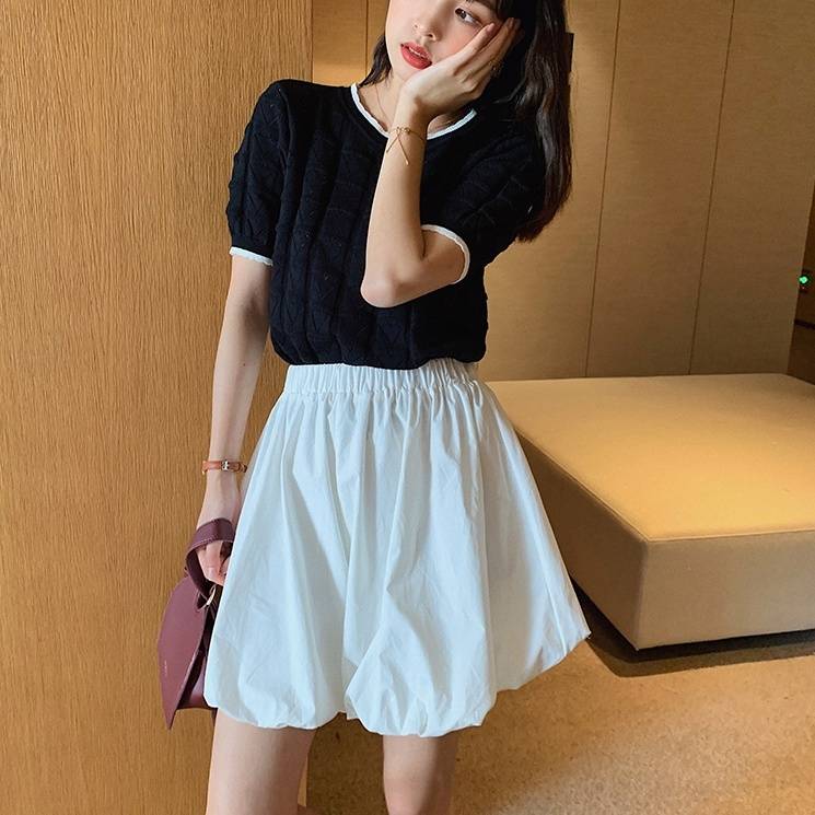ボトムスショートパンツキュロットバルーンフレアパンツミニ丈体形カバーナチュラルリラックスウエストゴムプラスサイズボリュームキュートガーリーシンプル大人女子かわいいモダンレトロブラックホワイト