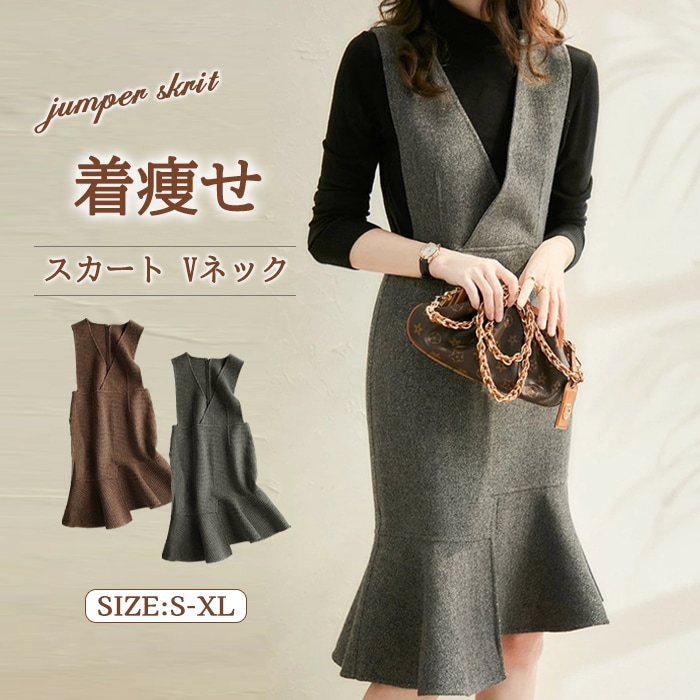 ワンピース 秋 レディース ジャンパースカート Vネック ジャンスカ サロペットスカート オールインワン 秋冬 きれいめ マーメイドスカート ロングスカート 大きいサイズ ゆったり あったか 着痩せ