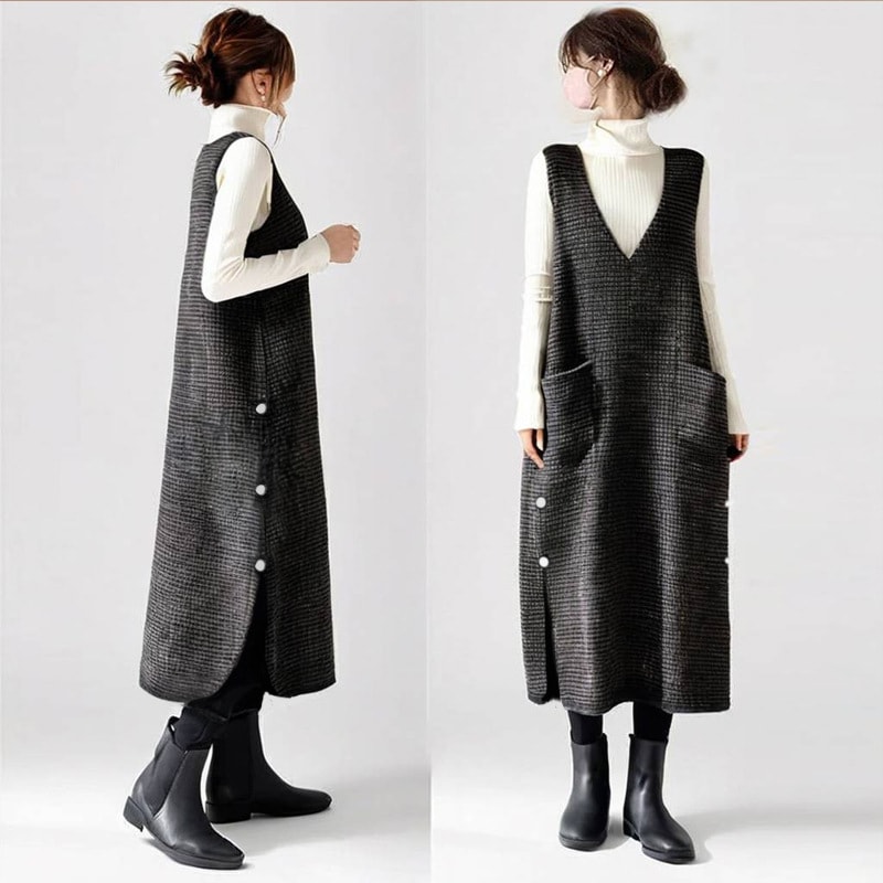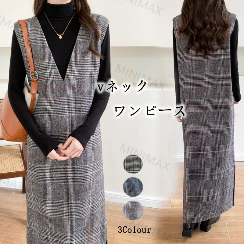 レディースプワンピースVネックノースリープワンピース 秋冬 ロング丈プワンピース オシャレ気品 ジャンパースカート
