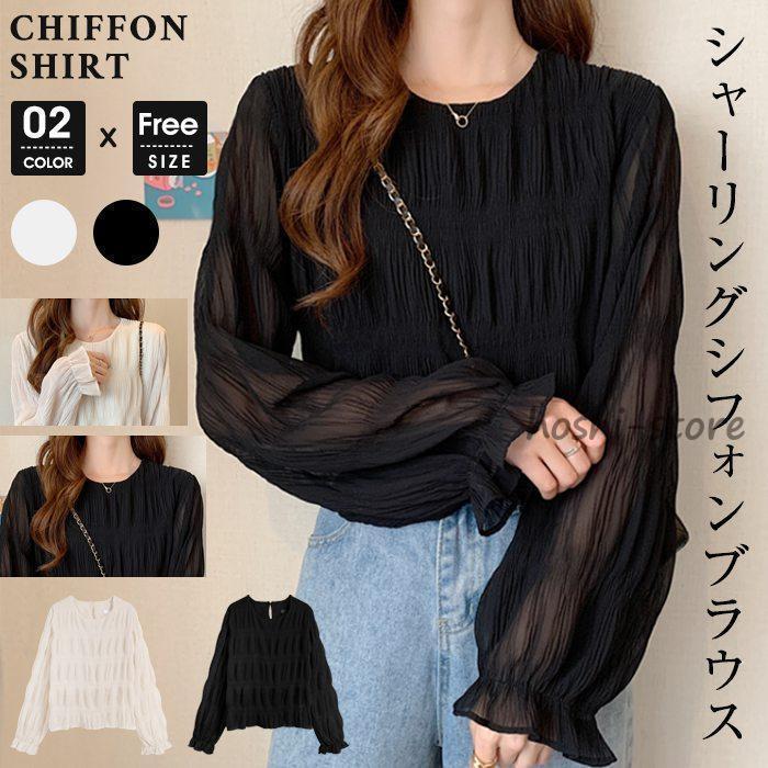 ブラウス 春 シフォン シャーリング ギャザー レディース シアー レース トップス シアートップス レイヤード フレア袖 シャツ ブラウス