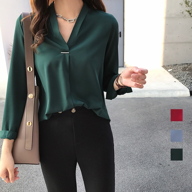2025年春新作韓国ファッションブラウス レディース オフィス 長袖 襟付き vネック シフォン 大き シャツ ブラウス