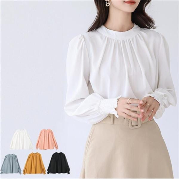ブラウス レディース 長袖 シャツ スタンドカラー 立ち襟 通勤 パール付き ファッション ビジネス フォーマル タック シャツ ブラウス