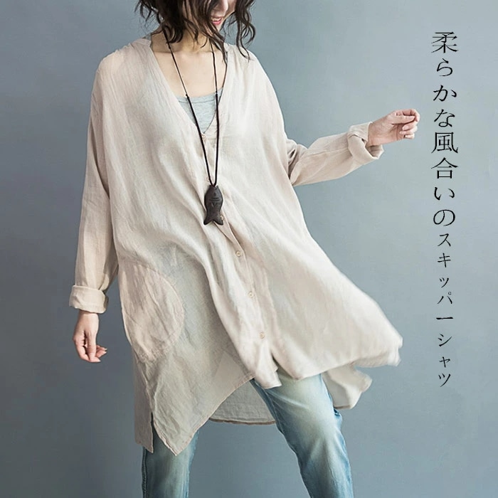 スキッパーシャツ とろみシャツ 綿麻 レディース リネン シャツ ロングシャツ 長袖シャツ 無地 麻混 レディースファッション トップス Vネック ボタン付き フリーサイズ 純色 薄手 シンプル ルー
