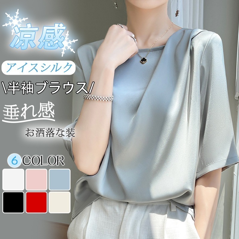 ブラウス 日韓国ファッション 高級感 サテン ブラウス 大人気質 百掛け 通勤半袖 tシャツ レディースアイスシルク半袖トップス 通勤Tシャツシフォンブラウス
