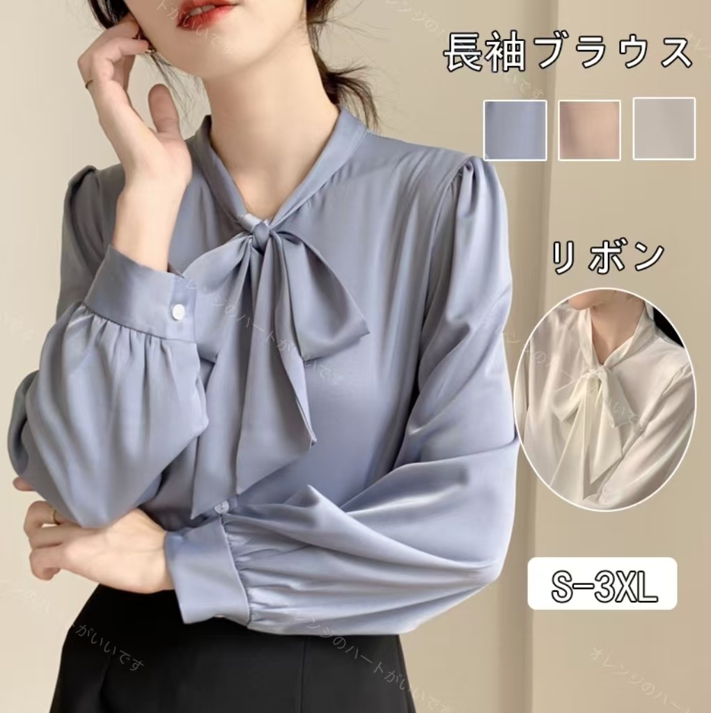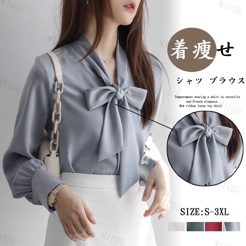 レディースブラウス長袖シャツオフィスガーリーリボン付きボウタイトップス シャツカジュアルゆったり春秋 体型カバーオフィスカジュアル シャツ ブラウス