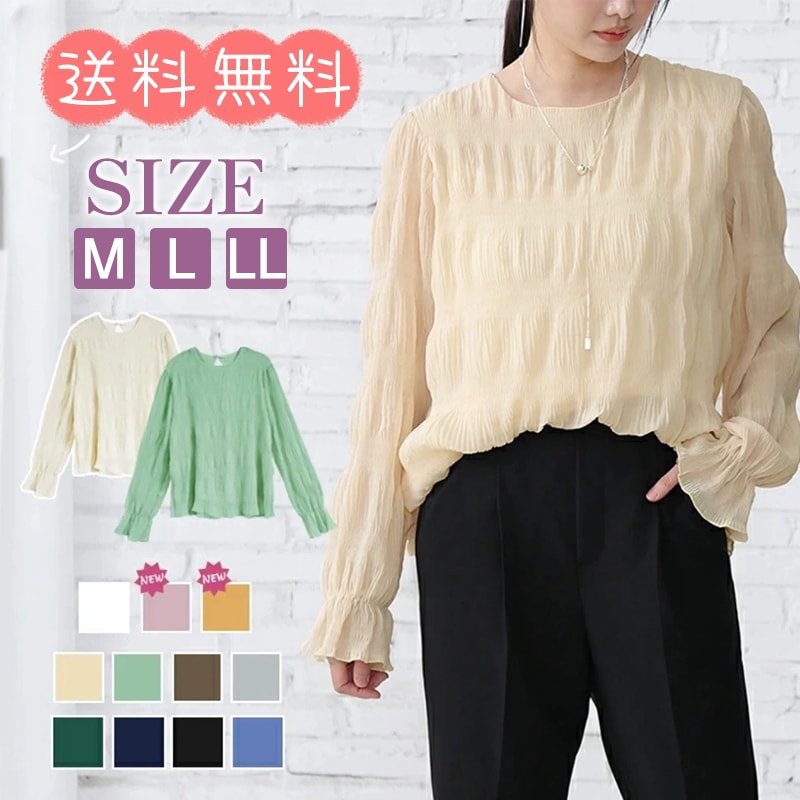 ブラウス ギャザー トップス プルオーバー 長袖 ラウンドネック シャーリング 透け感 シアー フリル フレア袖 ボリュームスリーブ レディースファッション 20代 30代 40代 50代 60代