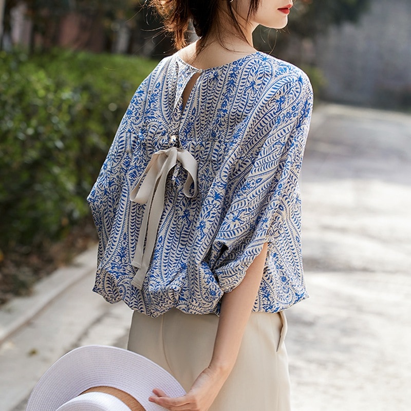 夏 Tシャツ ワンピース 半袖 花柄 シフォンブラウス 七分袖 ランタンスリーブ 蝶結び 美背 デザイン ゆったり ラウンドネック 韓国ファッション