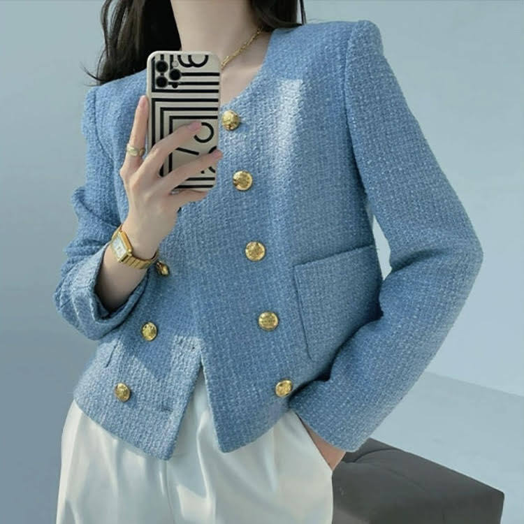 ハイエンドツイードジャケット ツイードジャケット ツイード ジャケット 水色 高級 高見え 高見えジャケット 青 ブルー オルチャン 韓国 レディース ノーカラージャケット ショート丈ジャケット