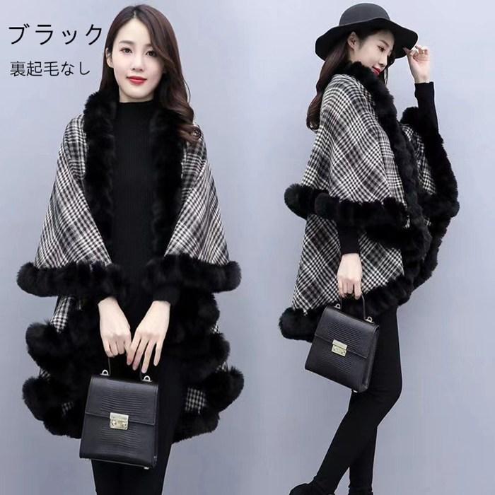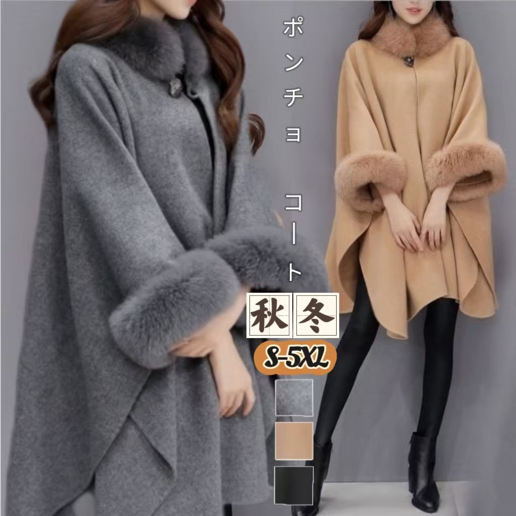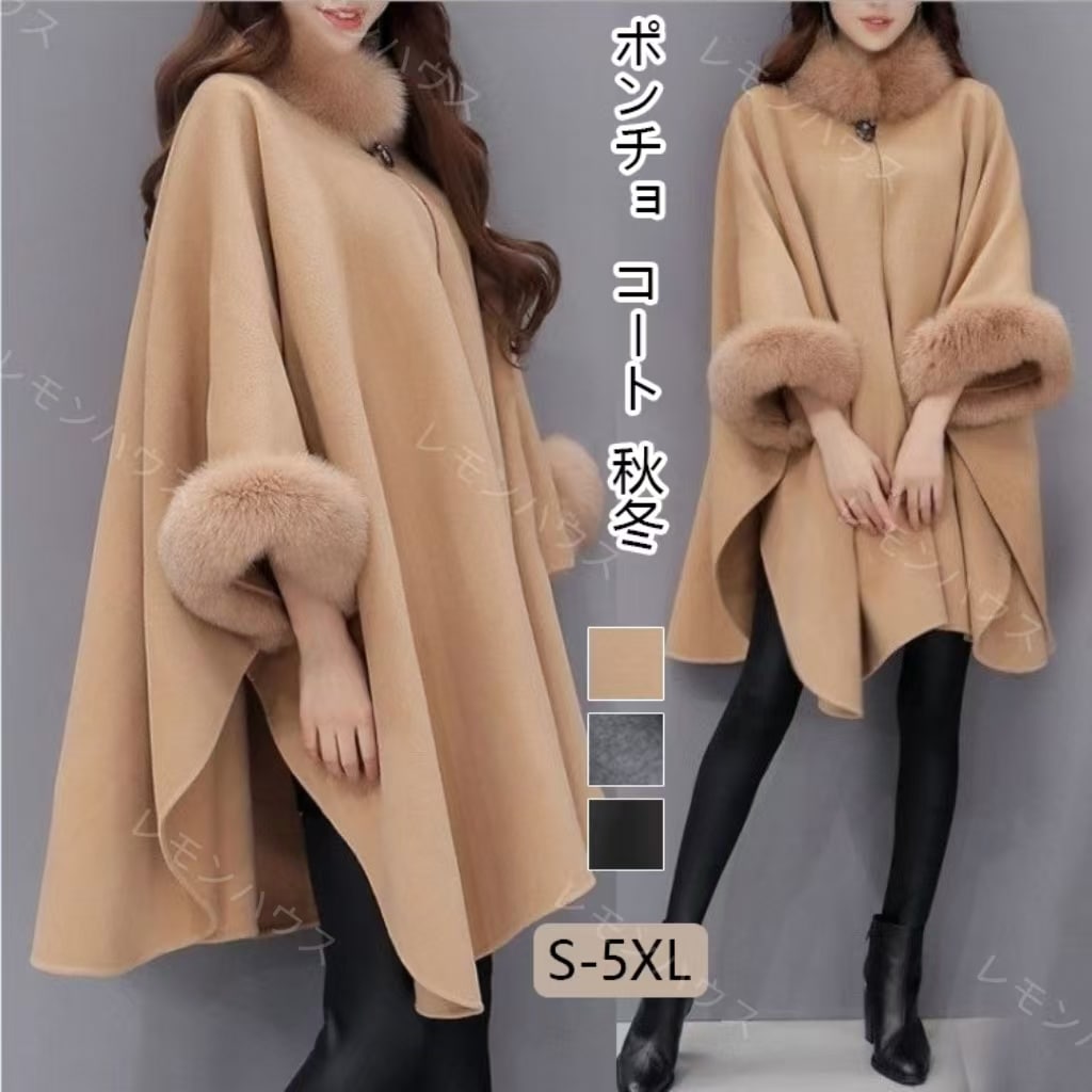 秋冬ファー付きケープコートゆったりフォックスフェイクファーポンチョ レディースマントコート 羽織アウター防寒コート大人あったか 女性ストールコート婦人服