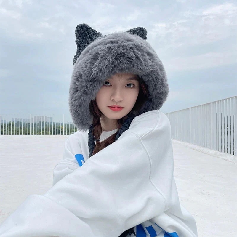 耳ガードおさげのモコモコ優しい女の子可愛い 女優帽 クリスマス レディースファッション 冬 防寒 猫耳 ニット 韓国 秋 帽子 ニット帽 暖かい