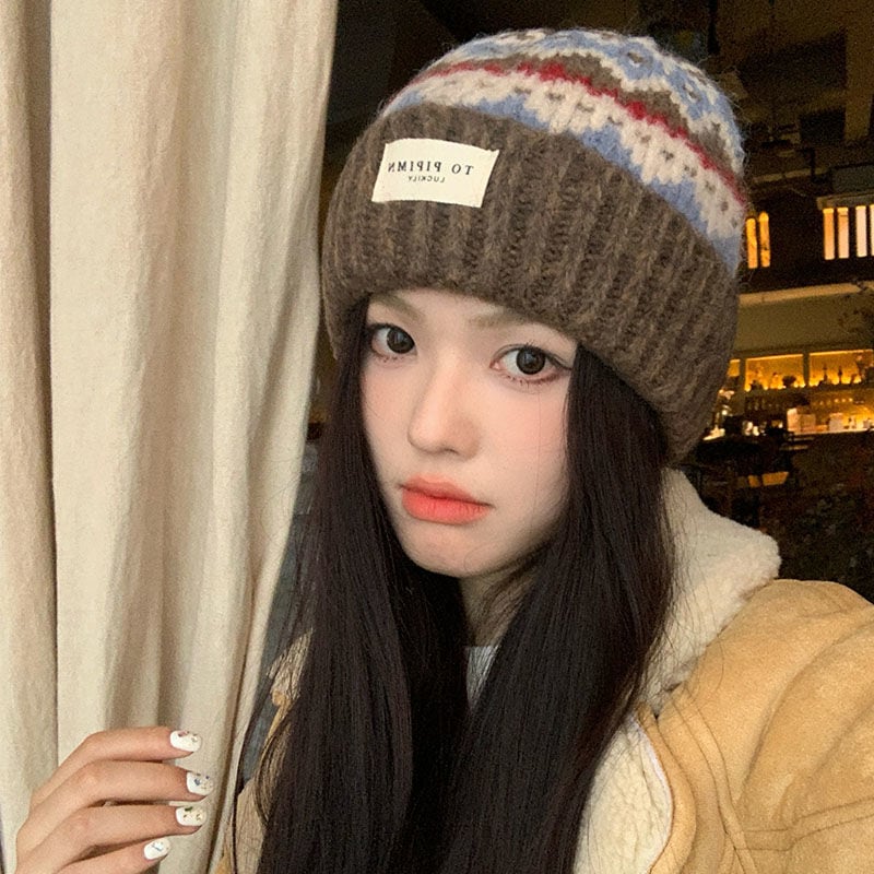 レトロな雰囲気感ニット毛糸帽女性秋冬ゆるい大頭囲冷帽保温耳保護帽顔小帽子 ニット帽