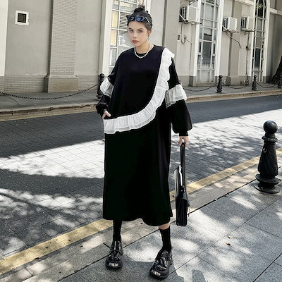 新作 レトロ ワンピース デザイン 長袖ワンピース ラッフル 切り替え ワンピース ラウンドネック ゆったり 大きいサイズ 着やせ おしゃれ ワンピース レディース パーティードレス