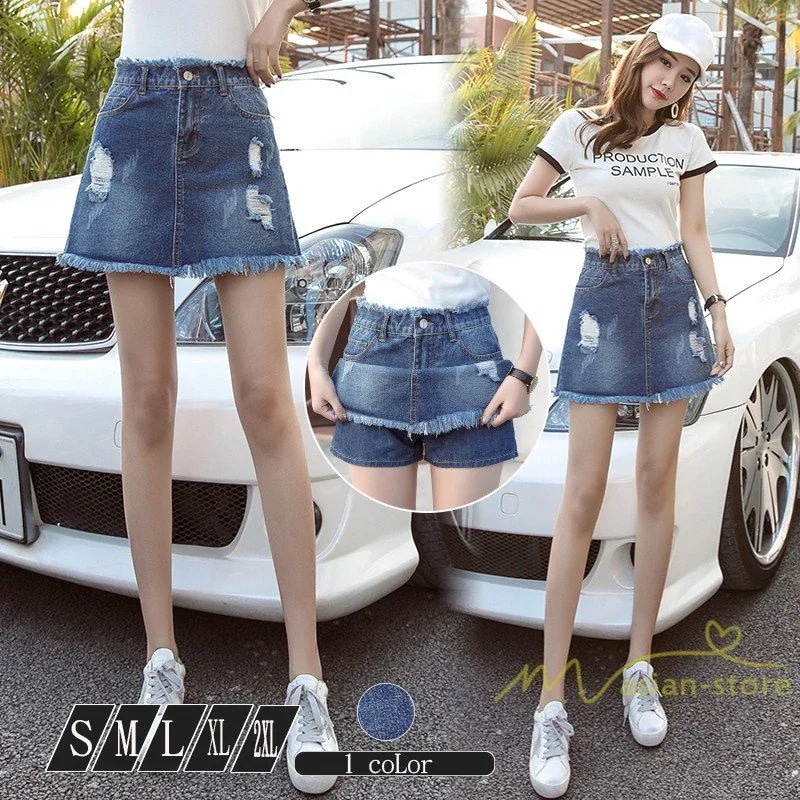 限定 デニムスカート キュロットスカート 台形スカート インナーパンツ付き ハイウエスト ダメージ A ミニスカート