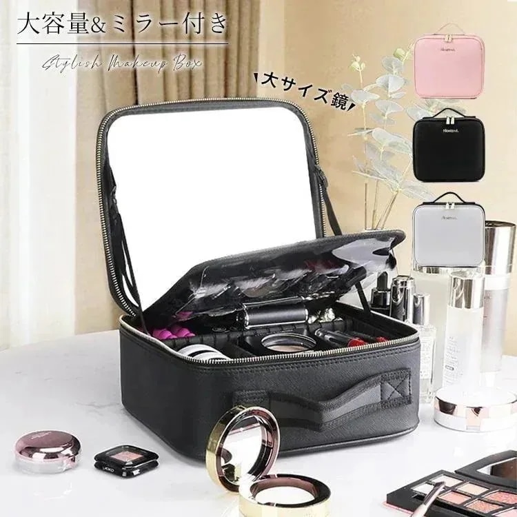 メイクボックス 大容量 鏡付き ミラー付き プロ用 コスメボックス コスメケース 化粧ボックス 化粧箱 仕切り レザー 防水 おしゃれ 持ち運び 旅行