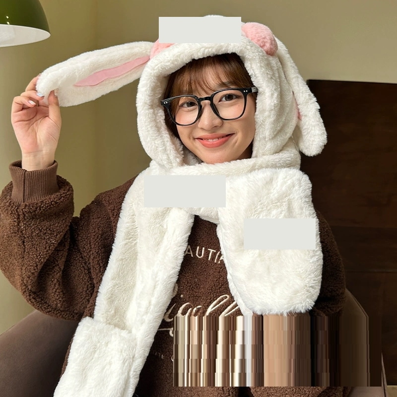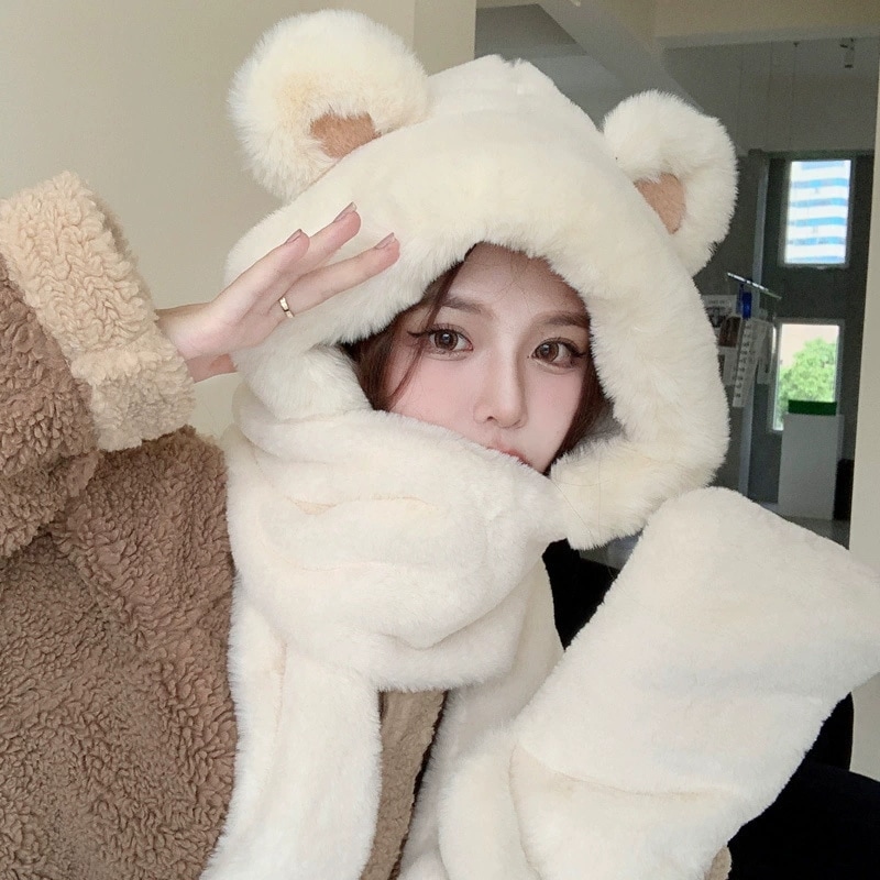 冬用の可愛いくまの帽子とスカラフ手袋がセットで卡通風のモフモフ素材でできており防風性に優れた保温性のニット帽です 耳あて イヤーマフラー