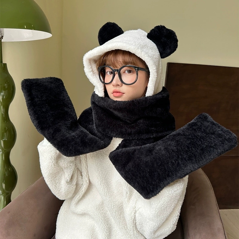 冬用の百搭なパンダの二重構造のモフモフ素材で耳を暖かく守るフード付き帽子です 耳あて イヤーマフラー