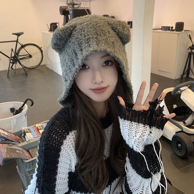 ニット帽 熊の耳ニットウールキャップ女性冬2024新しい韓国の帽子 ニット帽