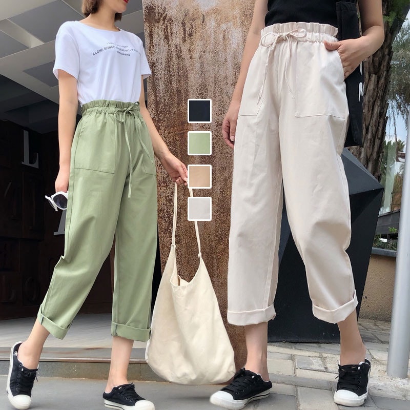 韓国ファッション春夏パンツ レディース 美脚 ロング ストレッチ 春 夏 黒 ブラック カラーパンツ カジュアル オールシーズン サルエルパンツ