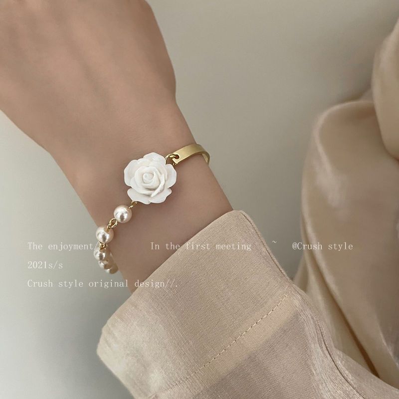 手元を美しく フラワー パール ブレスレット 着痩せ レディー バングル フレンチレトロ チェーン ハンドアクセサリー ブレスレット
