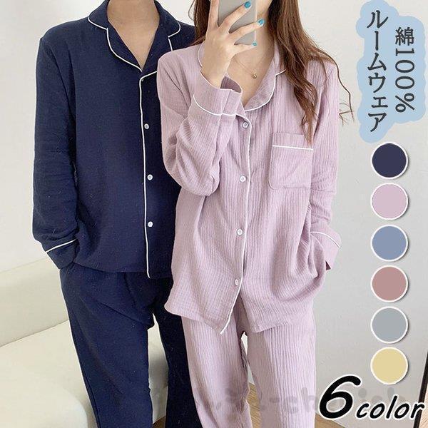 ヘアパジャマ カップルルームウェア レディース 秋冬 長袖パジャマ 前開き ロングズボン 綿100%上下セット 無地 メンズパジャマ ペアルック 部屋着 プレゼント