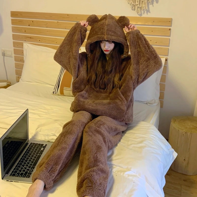 パジャマ 冬ルームウェア 冬のベアーとベルベットのパジャマ冬の女性秋冬の新しいかわいいベルベットの厚い家庭服セット パジャマ