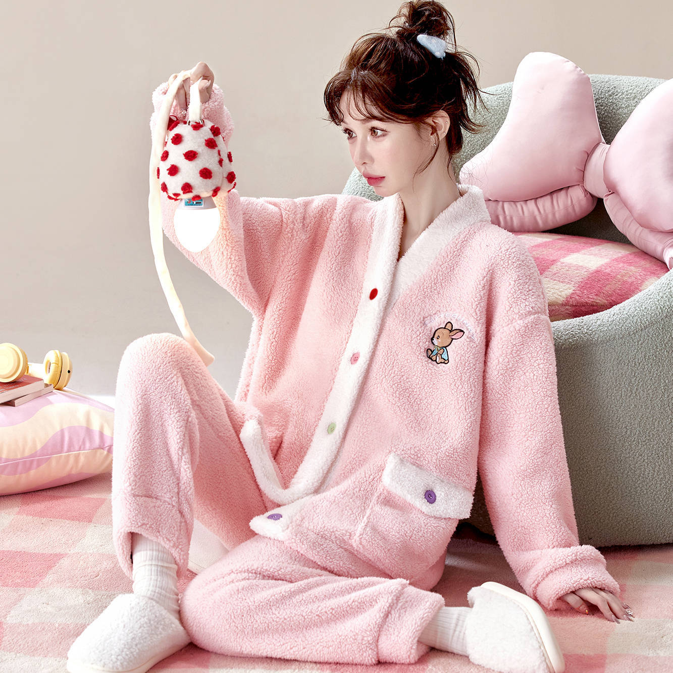 秋冬の甘くてかわいいフランネルの家庭服vネック学生のゆるいパイル保温パジャマセット女性メガ割 メガ割 秋冬 裏起毛 ルームウェア 上下セット 長袖