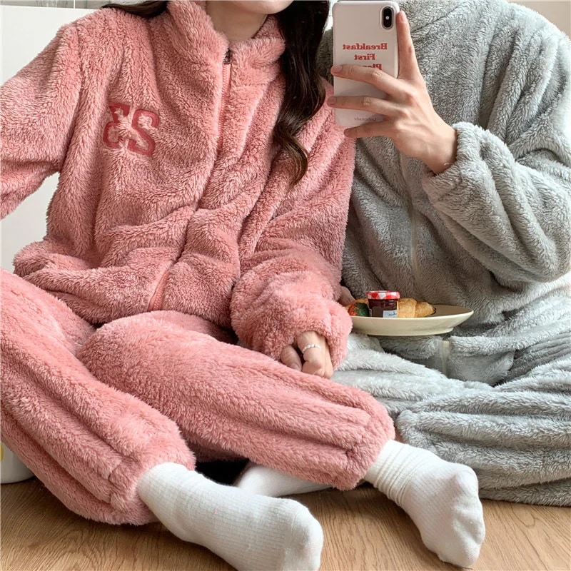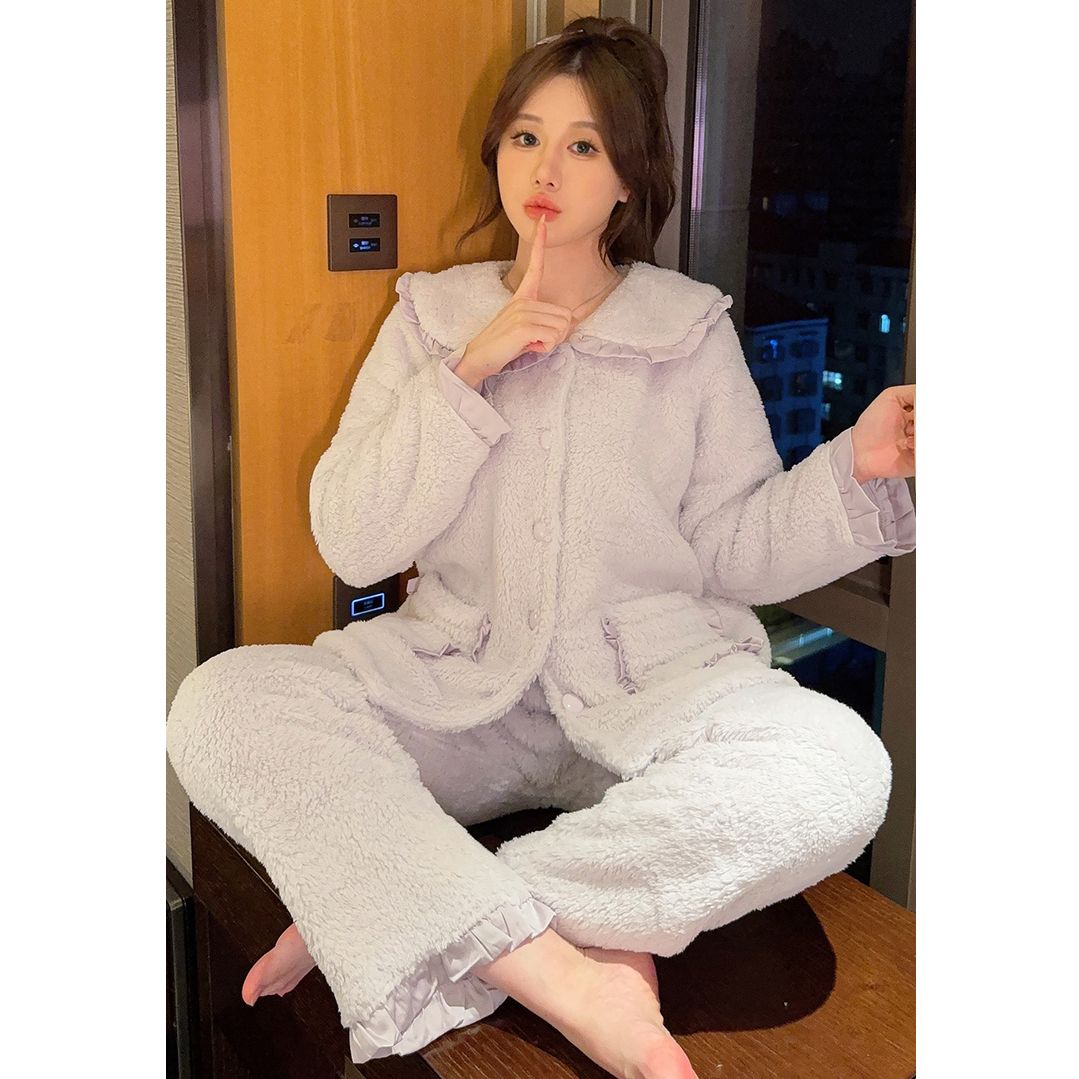 サンゴのパジャマ女性の冬の新しいカーディガンのゆるい紫色の甘いベルベットの厚い保温フランネルの家庭服メガ割 メガ割 秋冬 裏起毛 ルームウェア 上下セット 長袖