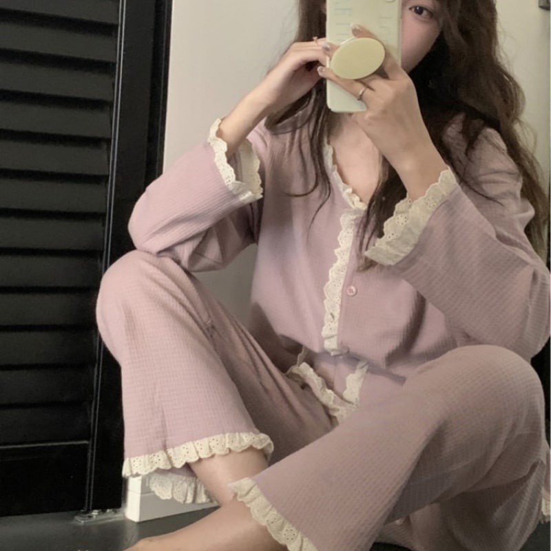 あったかルームウェア 韓国ファッション2点セットパジャマパジャマ レディース ルームウェアパジャマ部屋着 セットアップレディースパジャマレースルームウェア セットアップ