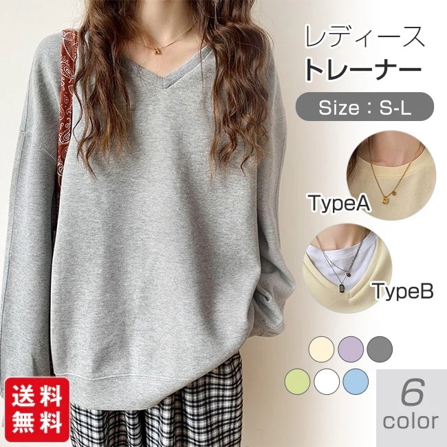 トレーナー レディース スウェット 長袖 シンプル トップス プルオーバー 秋 春 スポーツ 着痩せ 体型カバー クルーネック Vネック カットソー レイヤード 重ね着