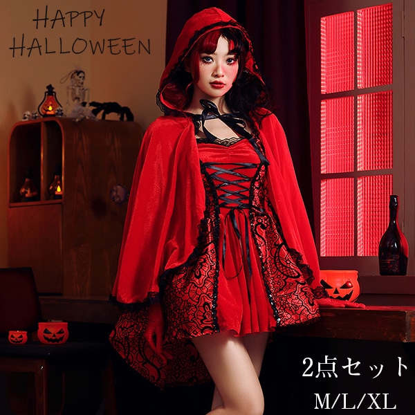 ハロウィン コスプレ 赤ずきん 2点セット 仮装 定番 衣装 大人 ワンピースとケープのセット 悪魔 デビル 童話 赤ずきん ゾンビ かわいい コスチューム 可愛い ハロウィンコスプレ 女性 ハロウィ