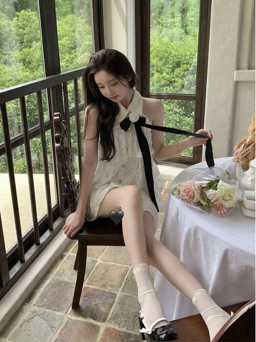 2024春夏ワンピース シフォンドレス ノースリーブ ハイネック スタンドカラー ミニ丈 Aライン フレア リボン 春服 韓国ファッション レディース おしゃれ かわいい キュート