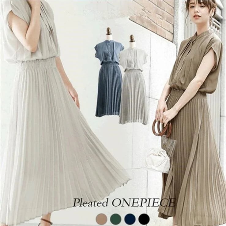 夏プリーツワンピース&全4色ロング マキシ ミモレ ギャザー フリル プリーツワンピース ウエスト スカートワンピース春 夏 水着 ビーチツアー ワンピース