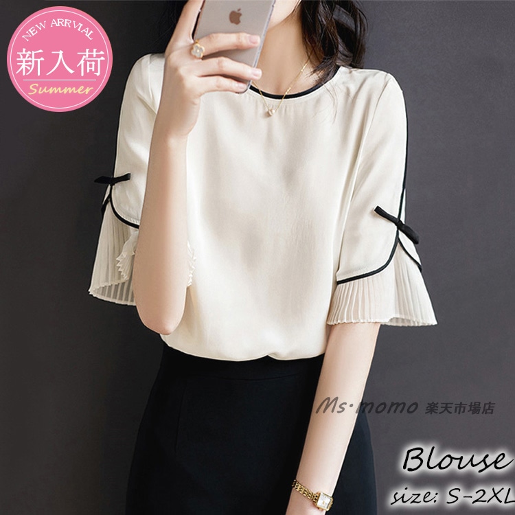ブラウス レディース 40代 春夏新作 オシャレブラウス 白シャツ 半袖トップス リボン プリーツ切り替え ブラウス 大人上品 通勤OL ゆったり シャツ30代 50代