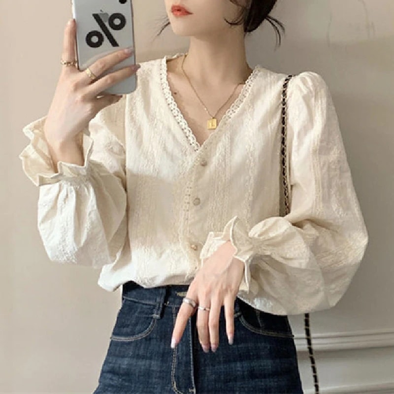シャツ シャツブラウス ブラウス トップス プルオーバー レディース レース 透かし雕り 長袖 フリル スプライス シースルー シフォン ベーシック カジュアル風