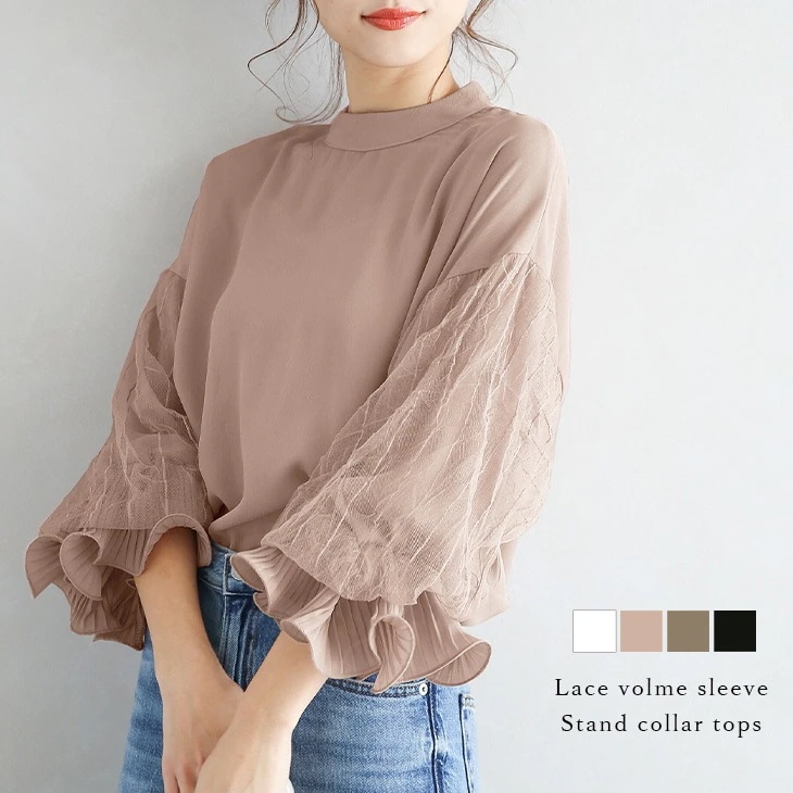 韓国ファッション ブラウス レース レディース スタンドカラー フリル袖 ボリューム袖 長袖 シアー 透け感 M L サイズ ホワイト ピンク カーキブラウン ブラック クラシカル れいめ ガーリー