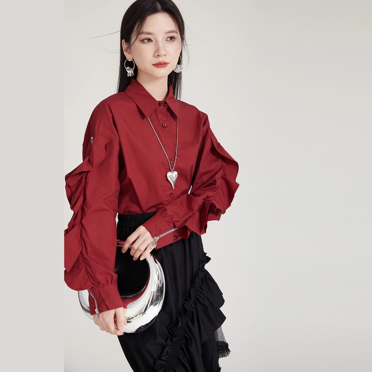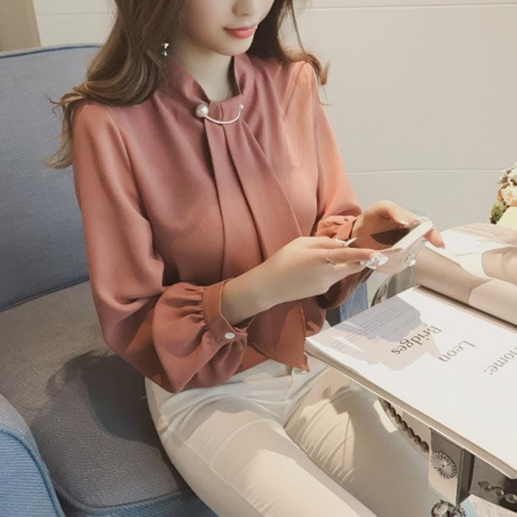 韓国春新通勤百掛け ファスナーハス葉袖シャツ痩せたシャツ若見え長袖ブラウス シャツ ブラウス