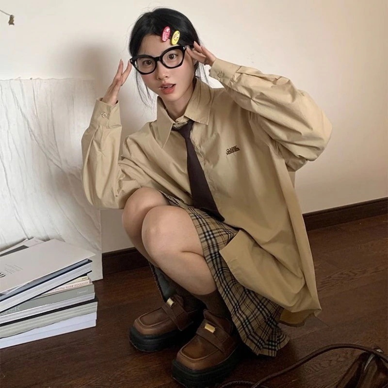 春秋の長袖フランスの上着のジッパーの大きな襟が色のゆるい怠惰な大きいサイズ ロングシャツ シャツ ブラウス