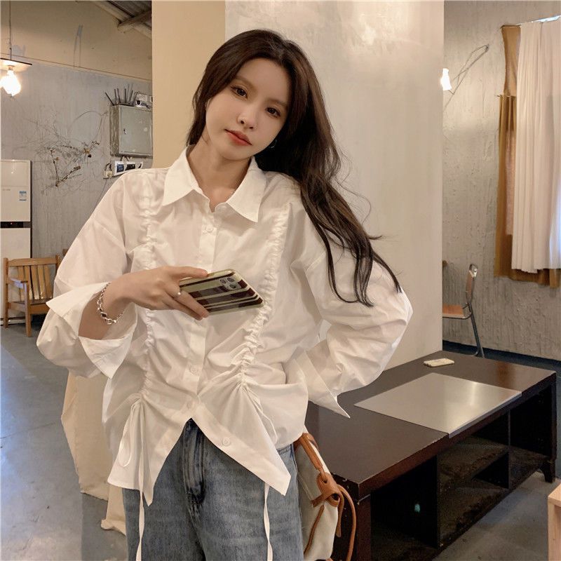 シャツ ブラウス レディース トップス今っぽシアーシャツ 韓国のシャツブラウス 新しい長袖ドローストリングシャツ女性 シャツ ブラウス