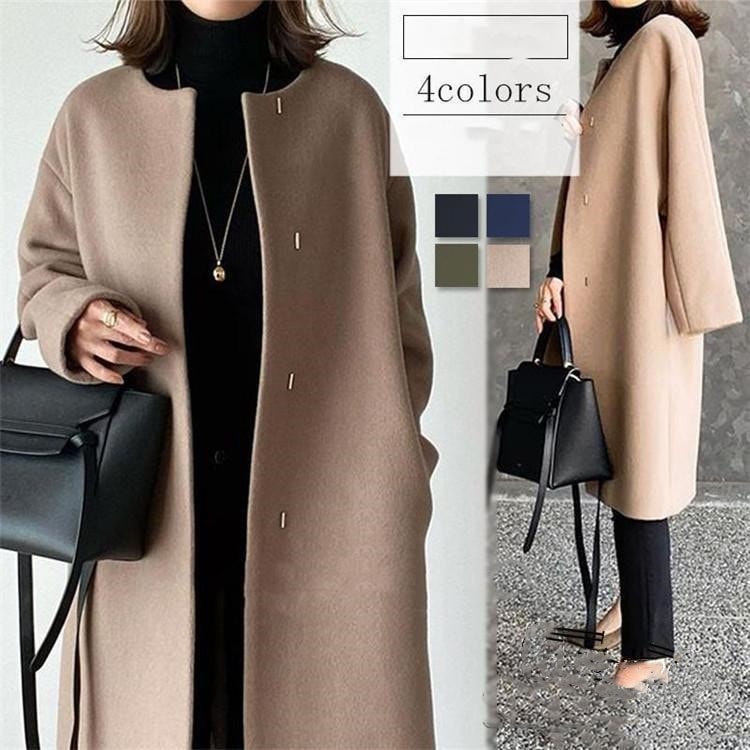 日系 新作 ウールコートシンプルロップショルダー アウター レディース 気質 カシミヤ ノーカラー コート おしゃれ スーツ 大人っばチエスタ一コ一ト 高 品 質 セミロング
