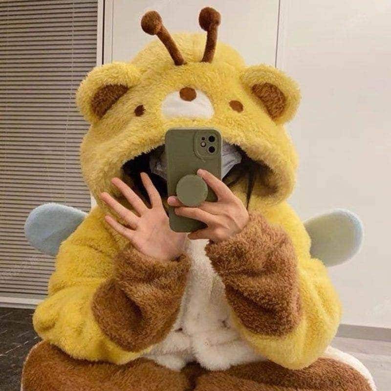 人气新作あったかルームウェアかわいいミツバチ ウールのガウン 男女同じカップル秋冬 サンゴのパジャマ ロングタイプ 部屋着セット 着ぐるみ