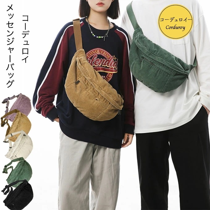 大きめ コーデュロイ メッセンジャーバック サコッシュバッグ リポーターバッグ レディース メンズ 男女兼用 たっぷり収納 外側2ポケット メッシュポケット 斜め掛け ブラック 黒