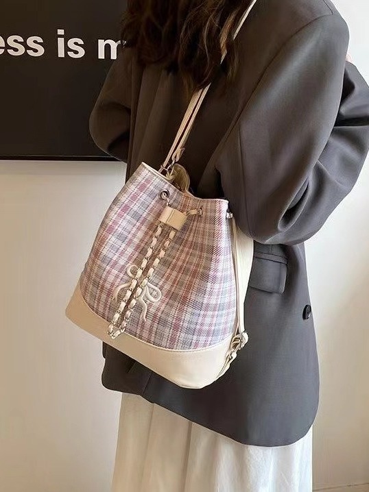 カジュアルレトロ大容量バッグ女性新しいファッション格子ハンドヘルドバケツバッグ多機能シングルショルダークロスボディバッグ ショルダーバッグ