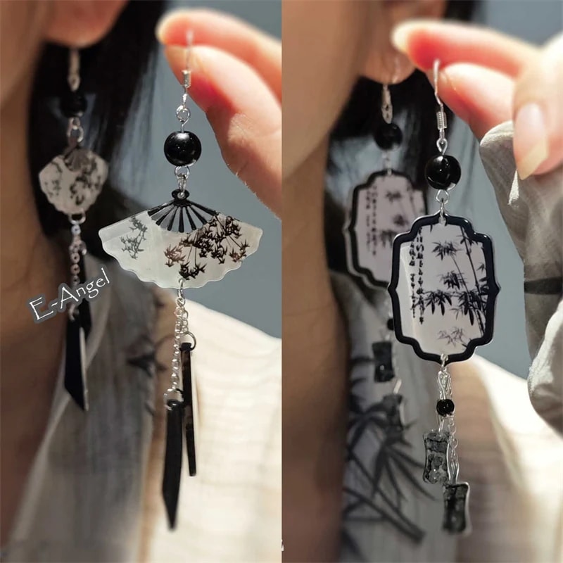 チャイナ風耳飾り アクセサリー 可愛い ピアス イヤリング 大ぶり 揺れる 扇子 竹柄 水墨画 成人式 日常 撮影 合わせやすい 個性的 ピアス