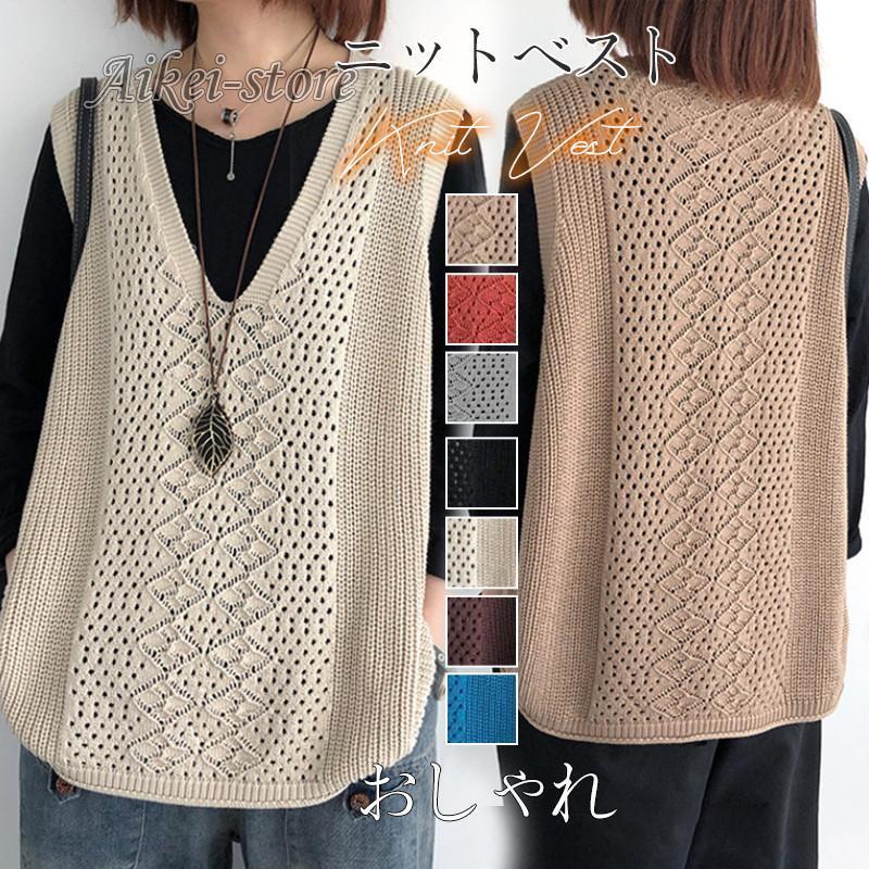 ニットベスト レディース チョッキ トップス Vネック ノースリーブ ゆったり プルオーバー ベスト ジレー セーター 無地 秋コーデ カジュアル